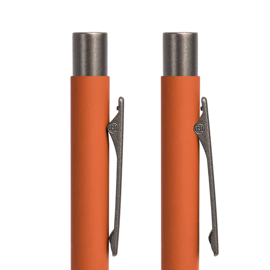 Модель ручки FACTOR – это оптимальный выбор для тех, кто предпочитает добротное качество, надежность и изящную простоту. Этой ручкой писать легко и удобно, она буквально скользит по бумаге благодаря качественным чернилам и надежному пишущему узлу. Все эти качества позволят ручке служить вам верой и правдой долгое время. А клип и корпус данной модели отлично подойдут для нанесения вашего логотипа. • Pantone, близкий к 1585 С• Размер 140*10 мм• Корпус из алюминия с покрытием soft touch• Металлический клип-прищепка серого цвета • Пластиковые носик и кнопка в цвет клипа• Нажимной механизм подачи стержня• Пулевидный пишущий узел 1.0 мм• Длина линии письма 1000 м • Чернила Dokumental. Цвет чернил синий• Сменный стержень Parker type• При гравировке вскрывается натуральный цвет алюминия, который может быть либо более белый, либо более серого оттенка.