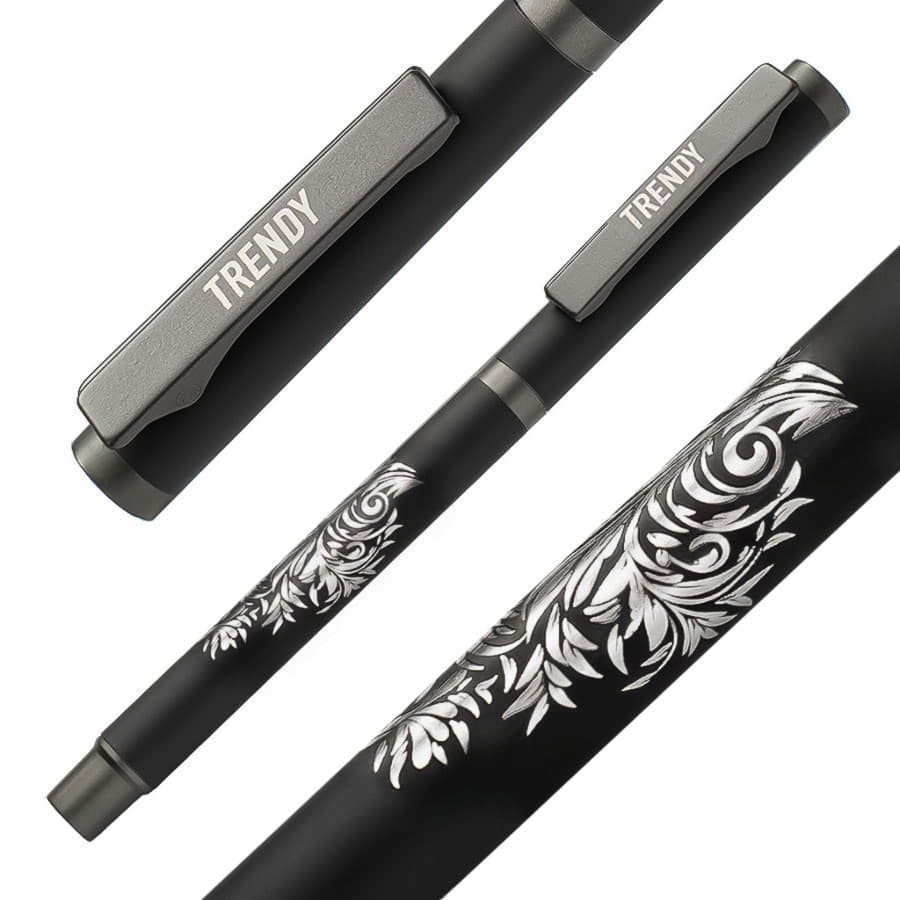 Название данной ручки даже не нужно переводить с английского языка, ведь оно говорит само за себя. Необычная ручка с колпачком точно обратит на себя внимание на рынке рекламной индустрии, а колпачок послужит дополнительным элементом для нанесения. Сама же ручка является превосходным инструментом для письма. Стальной пищущий узел с шариком из карбида вольфрама, шелковая формула немецких чернил от Dokumental, удобный упор для пальцев обеспечат мягкое и комфортное письмо. Если вы готовы и открыты всему экспериментальному и новому, то модель TRENDY –правильный выбор. • Pantone, близкий к Black• Размер 135*10 мм• Корпус и колпачок из алюминия с покрытием soft touch• Металлический клип-прищепка серого цвета • Пластиковые носик и заглушка в цвет клипа• Пулевидный пишущий узел 1.0 мм• Длина линии письма 1000 м • Чернила Dokumental. Цвет чернил синий• Сменный стержень Parker type• Подложка вскрывается зеркалом