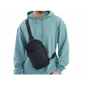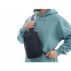 Легкий и удобный рюкзак-слинг обладает множеством достоинств: - благодаря возможности менять положение ремня, его можно носить слева и справа - непромокаемая ткань и молния - не страшен дождь - спереди карман на молнии - сетчатая спинка - карабин - ремень 130 см, регулирующийся по длине - нетканый мешок для хранения в комплекте