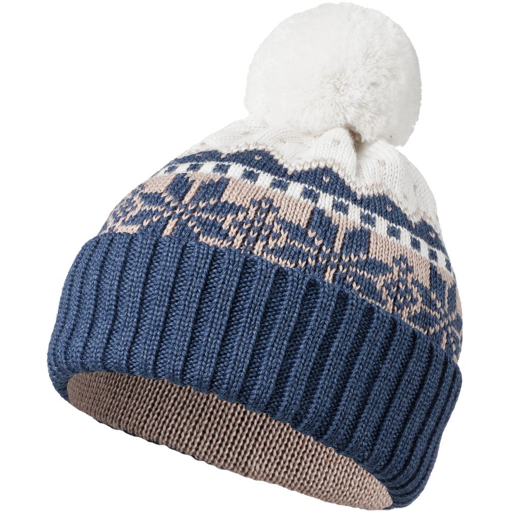Модель: удлиненная шапка с жаккардовым узором в 2-3 цвета, отворотом, помпоном.