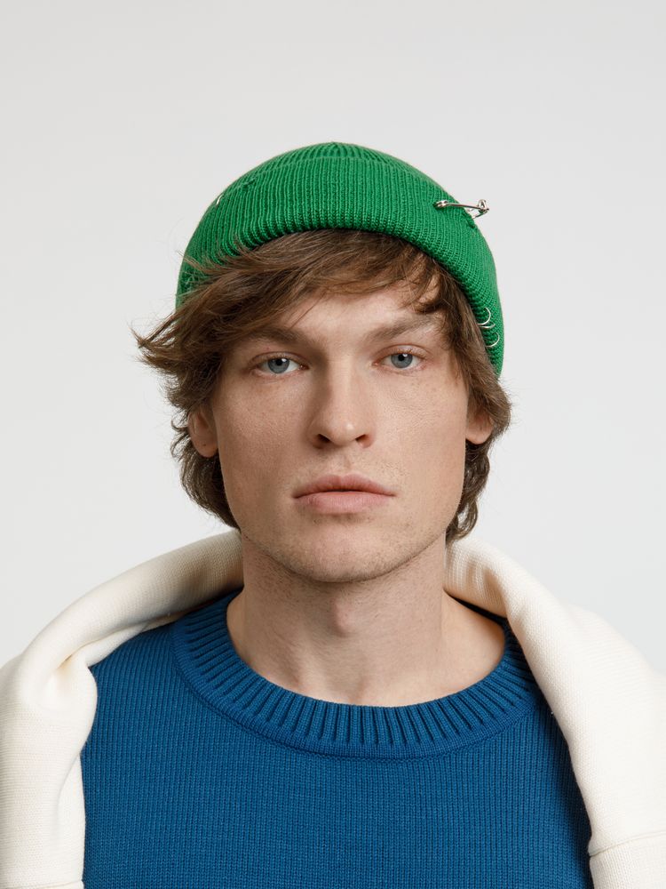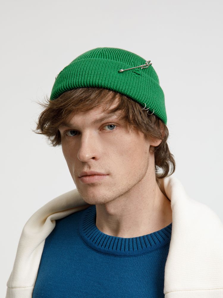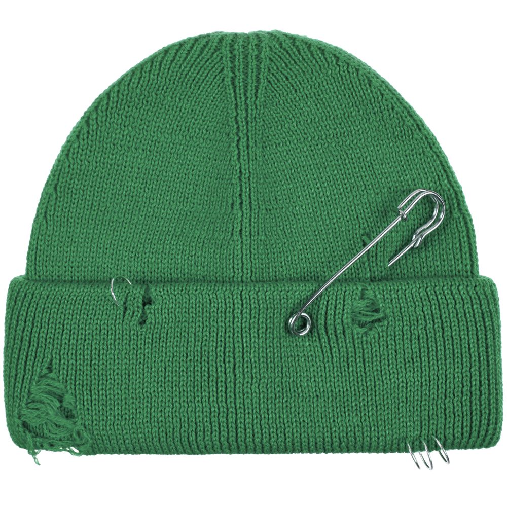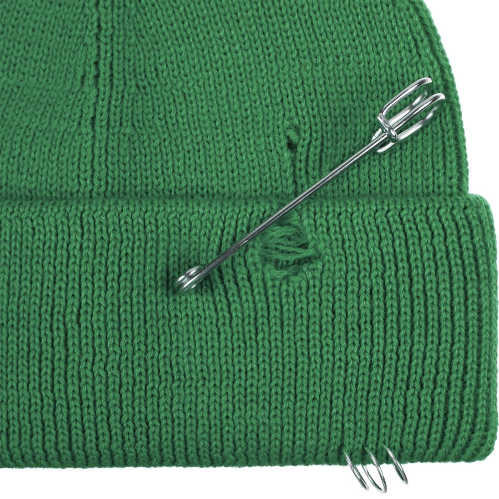 Однослойная шапка бини с рваным отворотом и металлическими аксессуарами для дерзких образов в любом возрасте. Яркий и запоминающийся акцент в стиле гранж.