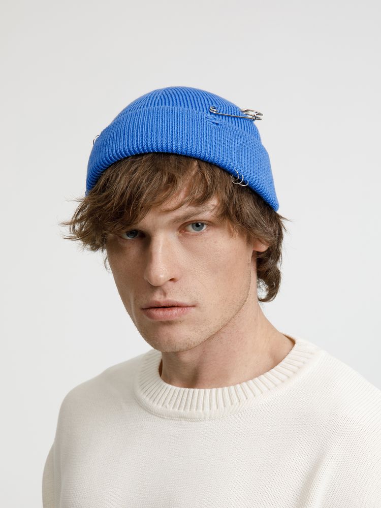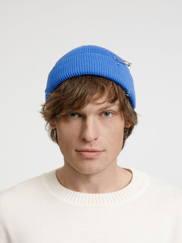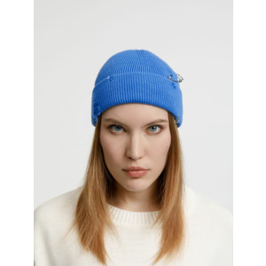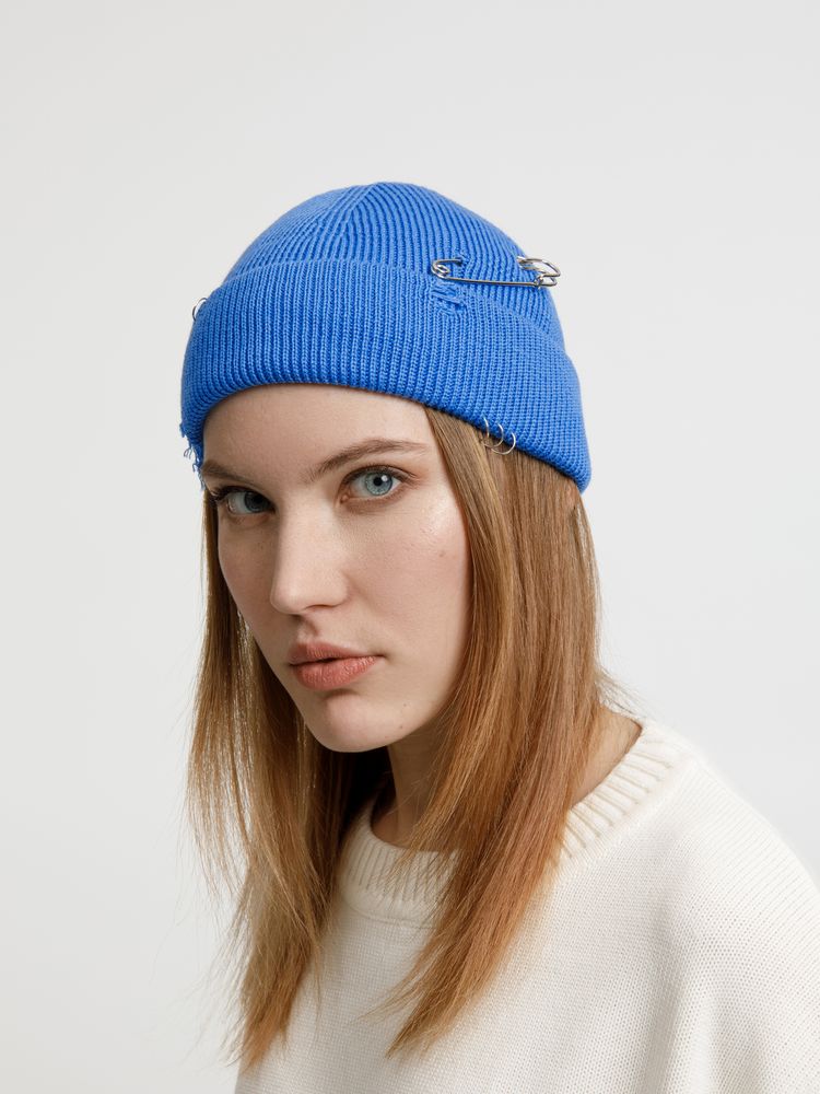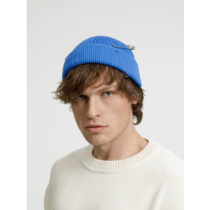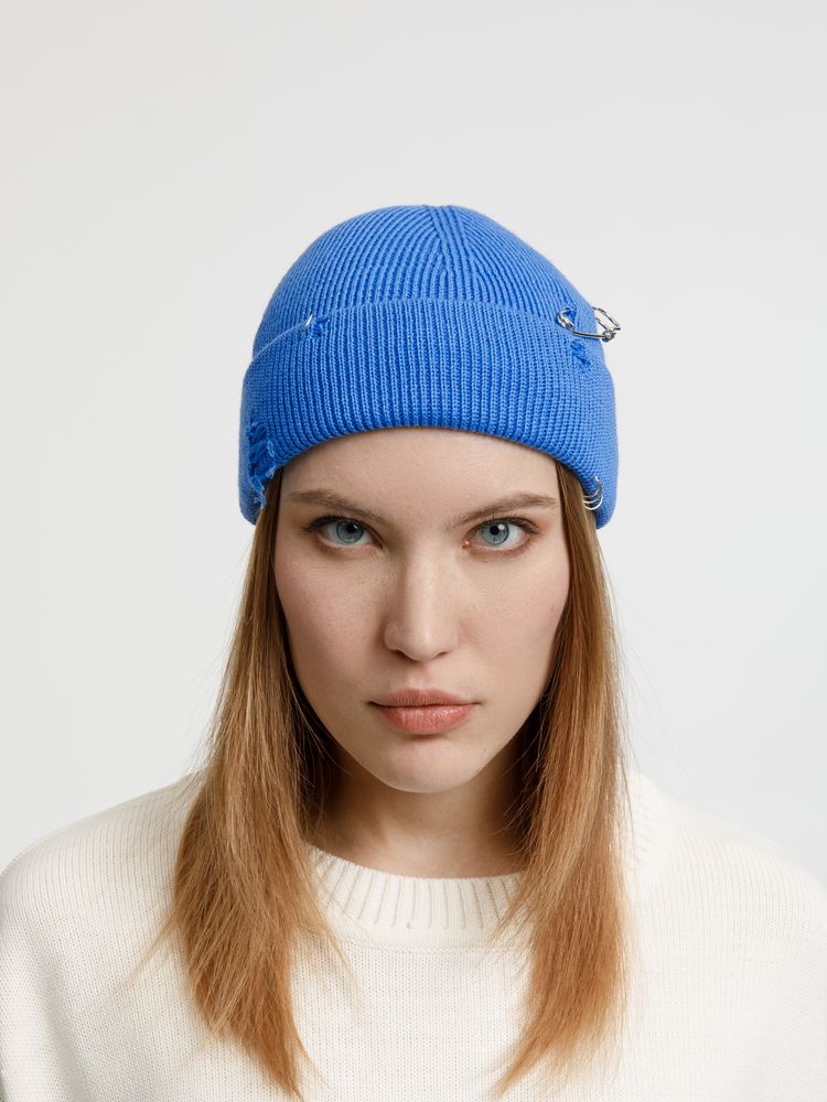 Однослойная шапка бини с рваным отворотом и металлическими аксессуарами для дерзких образов в любом возрасте. Яркий и запоминающийся акцент в стиле гранж.