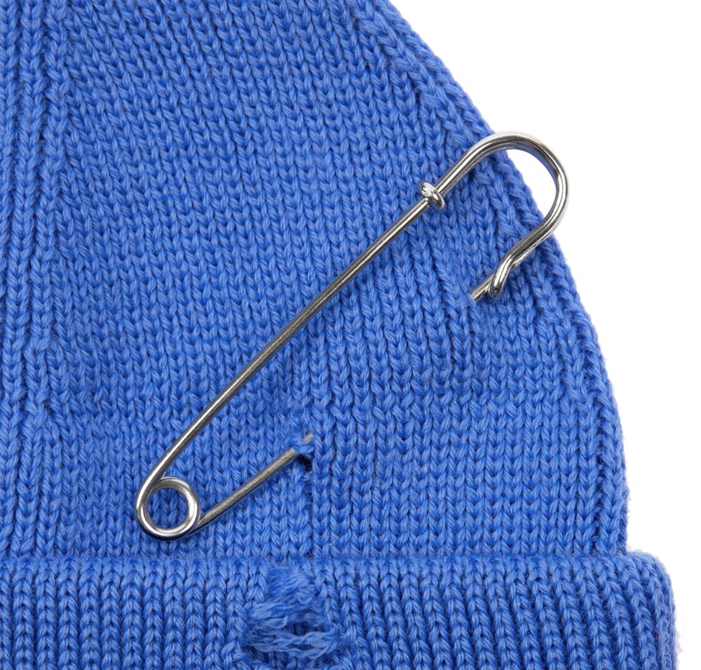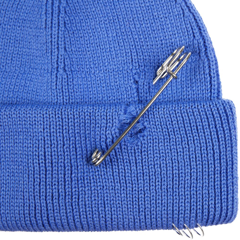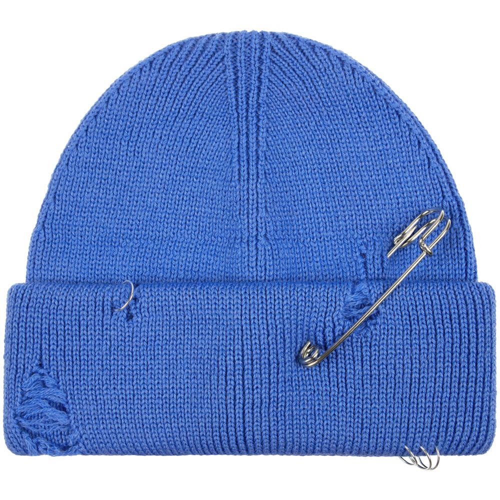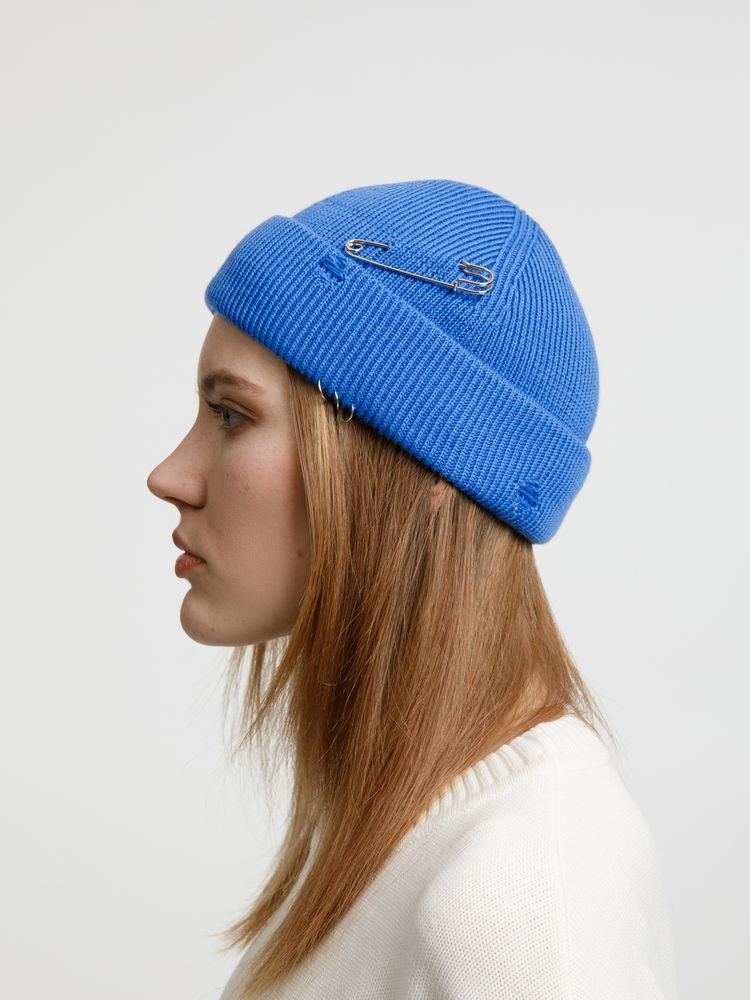 Однослойная шапка бини с рваным отворотом и металлическими аксессуарами для дерзких образов в любом возрасте. Яркий и запоминающийся акцент в стиле гранж.