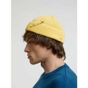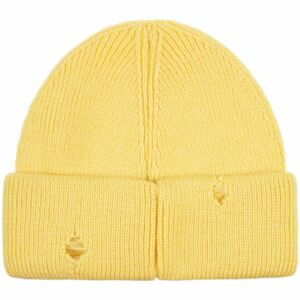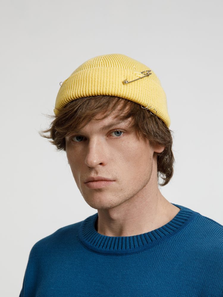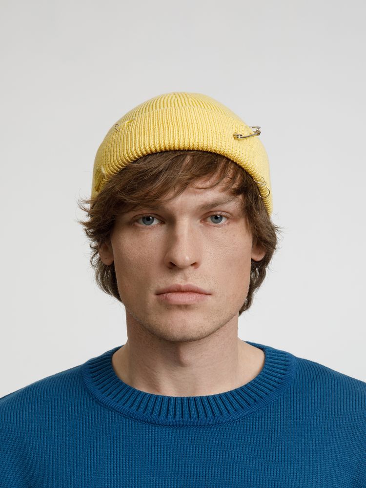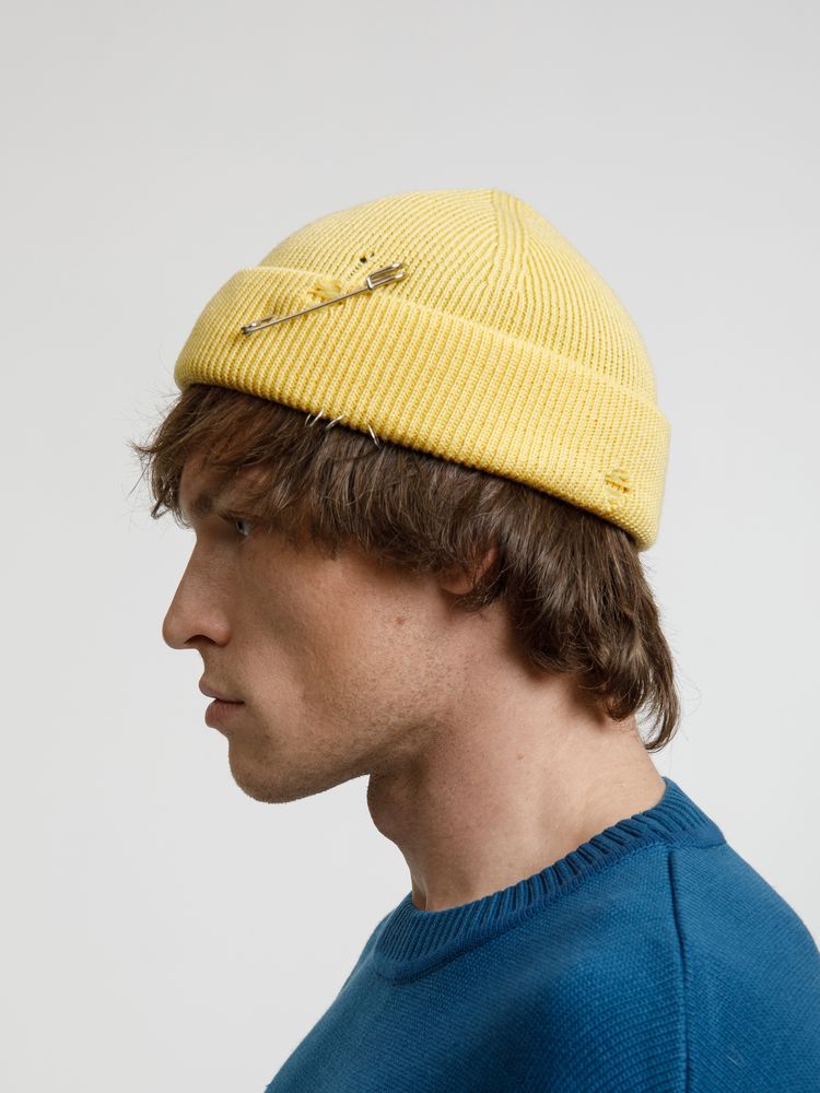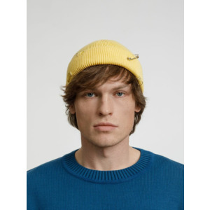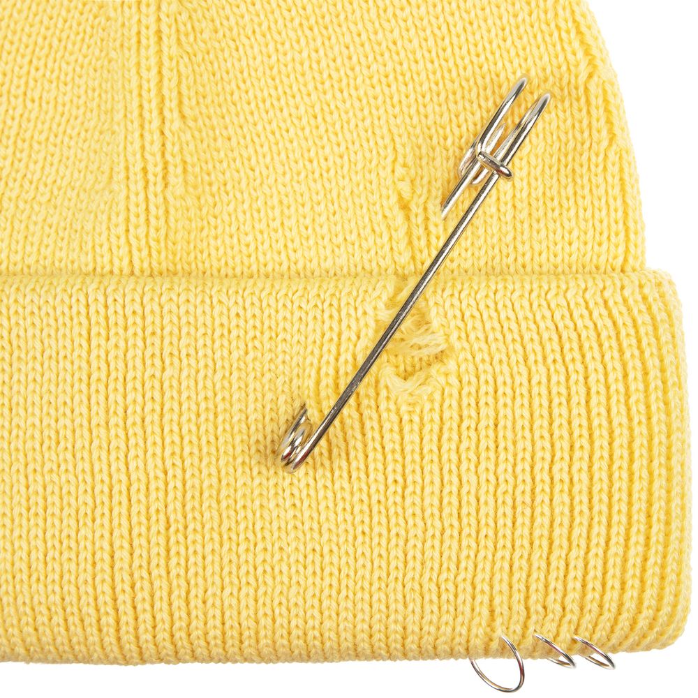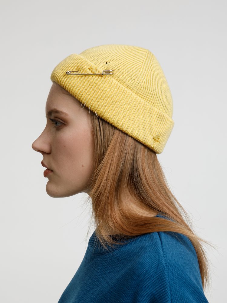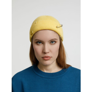 Однослойная шапка бини с рваным отворотом и металлическими аксессуарами для дерзких образов в любом возрасте. Яркий и запоминающийся акцент в стиле гранж.