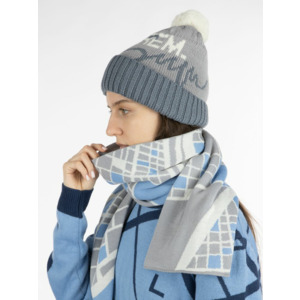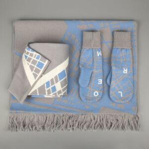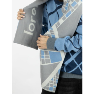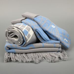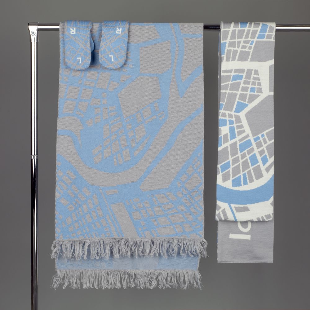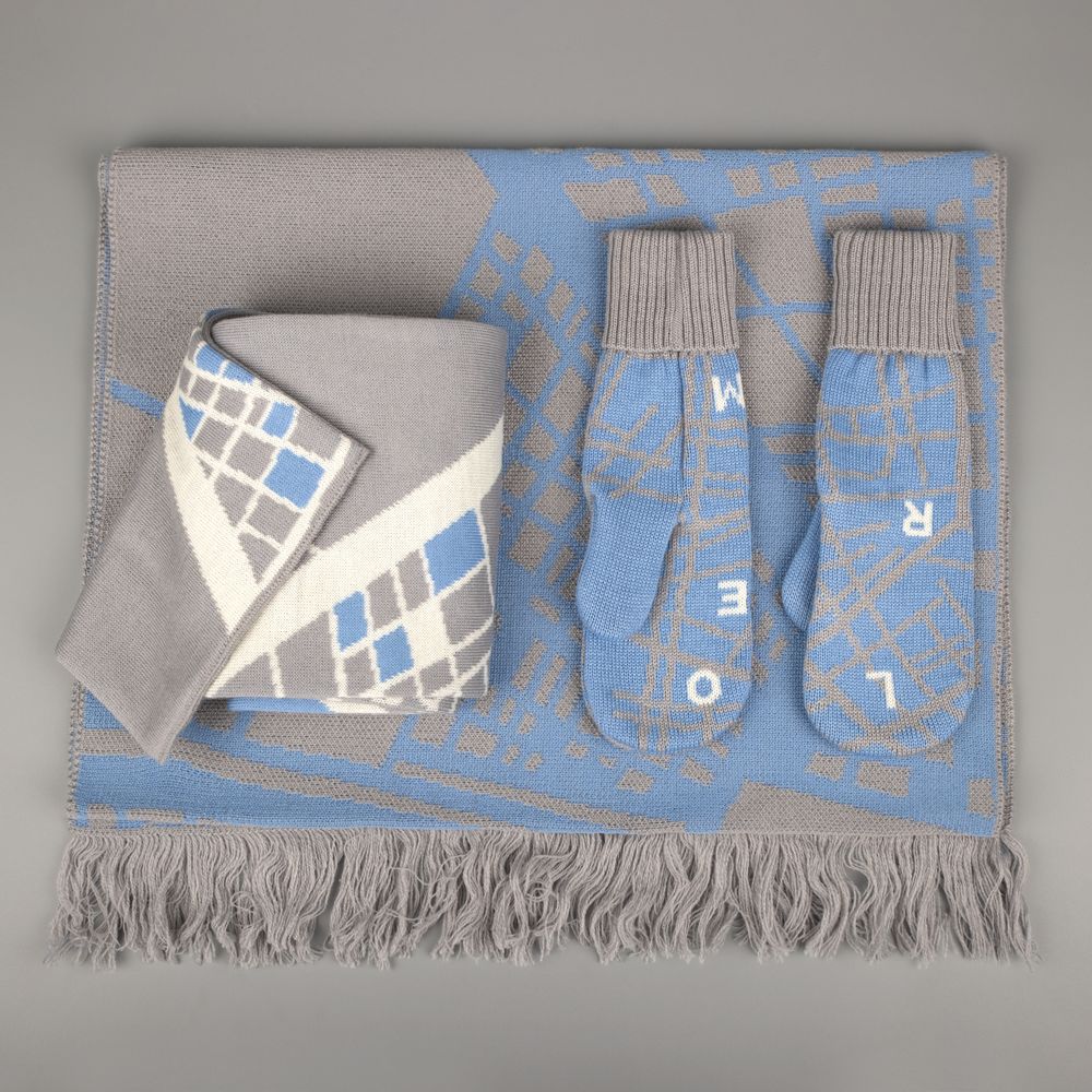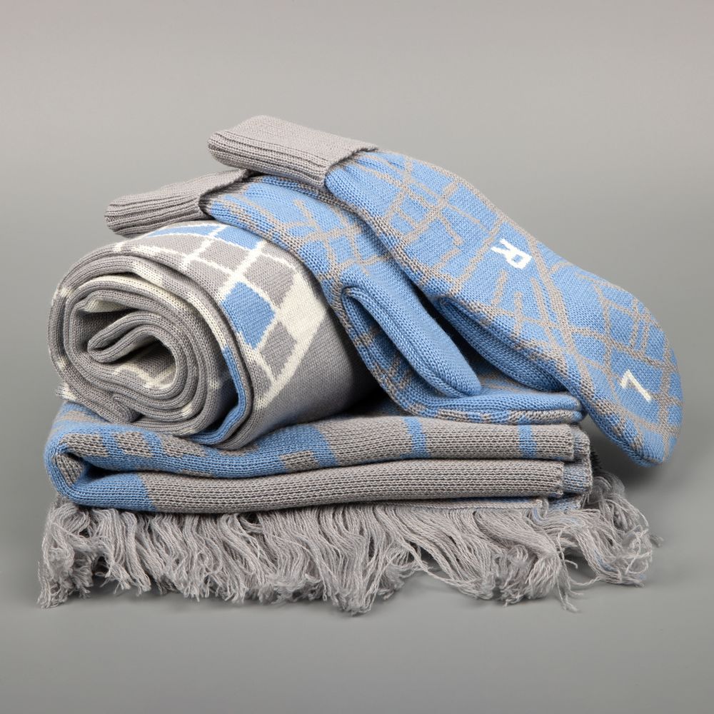 Шарф с вывязанным логотипом и индивидуальным рисунком в фирменной цветовой гамме.