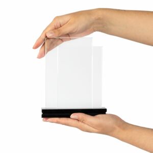 Стела Twinstand воплощает собой чистый минимализм, помноженный надвое, — для усиления эффекта и создания визуального объема и основательности. Легкая прозрачная вставка из двух листов боросиликатного стекла — идеальный баланс устойчивости и легкости, который позволит отметить вдвое больше заслуг или создать оригинальный запоминающийся дизайн с помощью креативного нанесения.