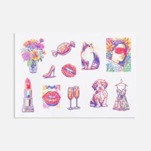 Тематические UV-DTF наклейки Thematik — яркие, красочные и слегка объемные наклейки с гладкой глянцевой поверхностью. Это удобный способ персонализировать любимые аксессуары: клеящий слой надежно удерживает наклейку на пластике, металле, керамике, коже, ПВХ, покрытии софт-тач и других поверхностях.