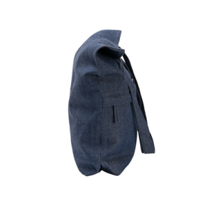 Сумка из переработанной джинсовой ткани с передним карманом на застежке. Высота ручек 29 см.