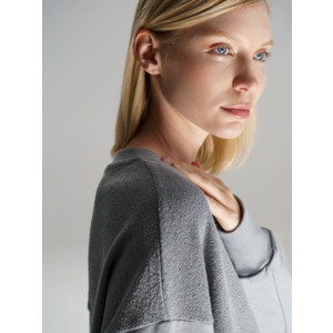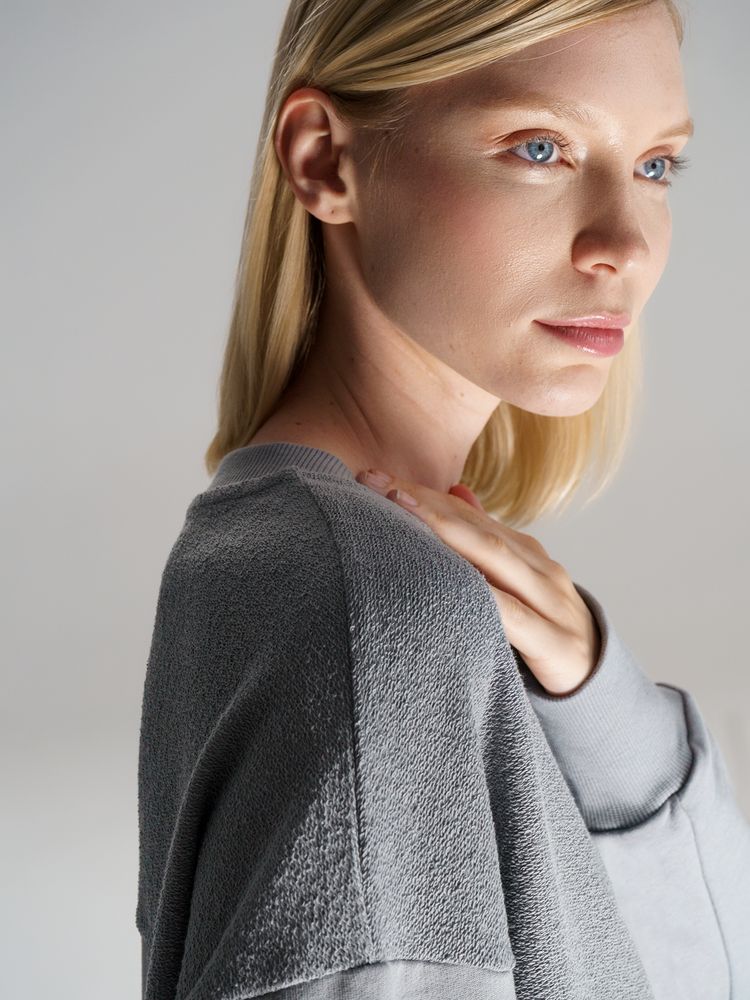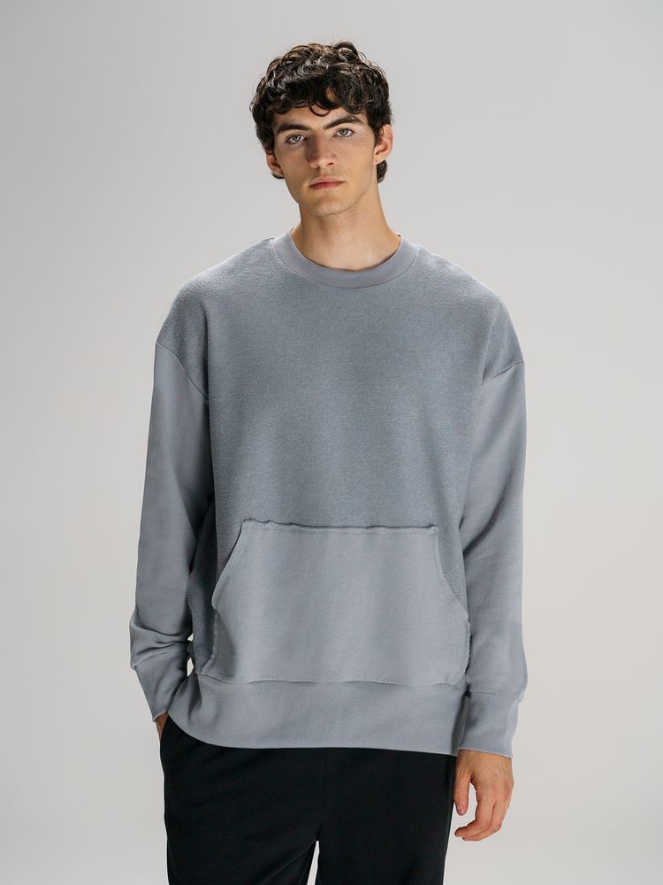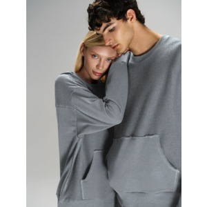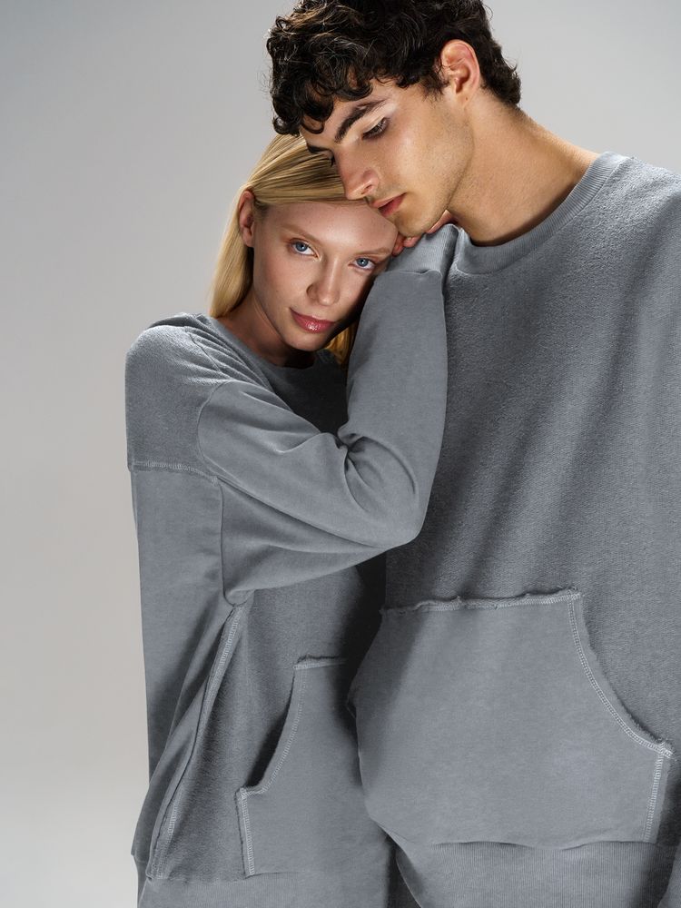 Благодаря особой конструкции, где часть деталей — перед и спинка — вывернута наизнанку, свитшот приобретает запоминающийся вид. Так внутренняя, обычно незаметная сторона материала превращается в лицевую: миниатюрные петельки бывшей изнанки становятся настоящим украшением толстовки, добавляя ей оригинальности и эффект невероятно приятной плюшевости.