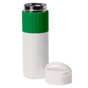 Термос TURBO с двойными стальными стенкамиСтильный белый матовый корпус термоса с цветной силиконовой манжетойДержатель на крышке для удобства переноскиГерметичная навинчивающаяся крышка не даст напитку пролиться