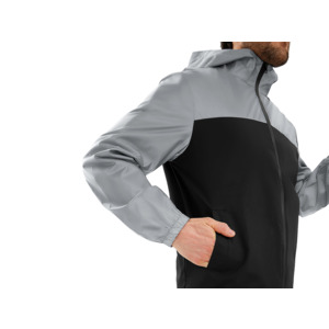 Streetwear-ветровка с контрастным дизайном: верх переда и спинки, рукава и капюшон — из светоотражающей ткани, низ — из прочной чёрной полиэстеровой ткани. Модель на подкладке, со спинкой длиннее переда. Детали: водонепроницаемая молния, боковые наклонные карманы с листочкой, манжеты на резинке, удобный капюшон, кулиска по низу. • Заметность в темноте — светоотражающая верхняя часть повышает безопасность. • Защита от ветра и дождя — влагостойкая молния и плотная ткань. • Комфортная посадка — удлинённая спинка и подкладка для межсезонья. • Универсальный городской стиль — легко сочетается с повседневным гардеробом.