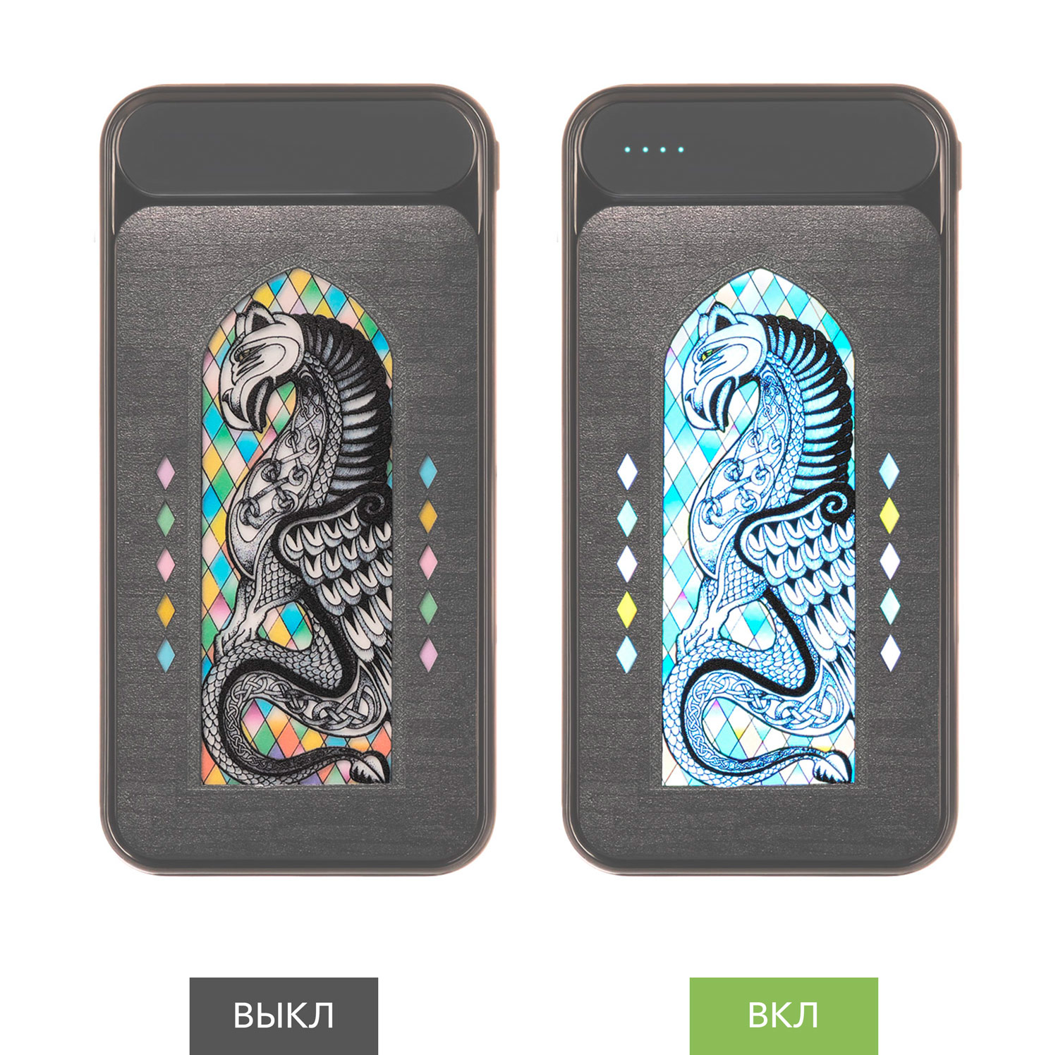 Внешний аккумулятор Starlight Plus 10000 mAh с расширенными возможностями персонализации покорит любого! Вся верхняя панель корпуса доступна для нанесения УФ-печати, которая позволяет создавать эффект гравировки, эффект витража и эффект день/ночь. Обратите внимание: из-за особенностей технологии производства, этот аккумулятор поставляется только с персонализацией.