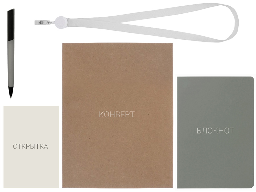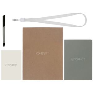 - Материал товара - блокнот - искусственная кожа, открытка - бумага, пакет - картон, ручка - пластик с покрытием софт-тач, ланьярд с ретрактором - полиэстер, металл, пластик