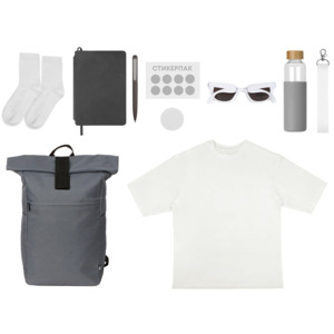 - Материал товара - рюкзак- 300D RPET полиэстер, футболка- 100% хлопок, джерси, носки- 80% хлопок, 15% полиамид, 5% эластан, бутылка- стекло, очки и держатель- пластик, ланъярд- полиэстер, ручка- металл, блокнот- термо PU