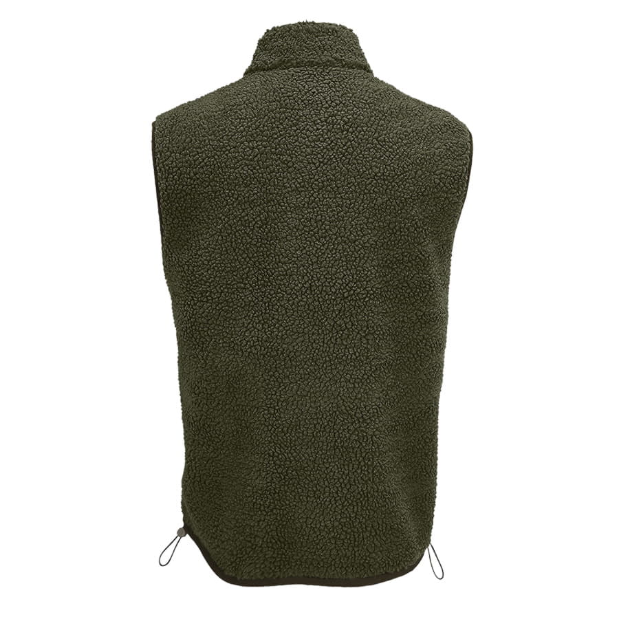Жилет унисекс из искусственного меха шерпа с карманами на молнии: 1 нагрудным из таслана для нанесения логотипа и 2 боковыми. Черные пуллеры на молниях со светоотражающими элементами. Слегка удлиненная спинка. Эластичный шнурок по низу изделия.