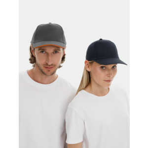 Модель бейсболки с 5-ю клиньями без лобового шва из плотного чесаного хлопка.