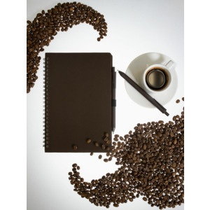 Блокнот на спирали из пластика и кофейного жмыха, дополнен резинкой для ручки.