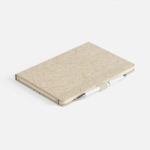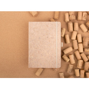 Блокнот с твердой обложкой из натуральной окрашенной пробки, дополнен петлей-резинкой для ручки, ляссе и резинкой в цвет обложки.