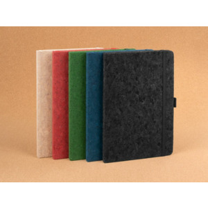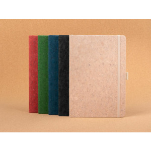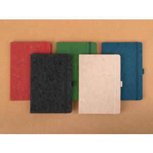 Блокнот с твердой обложкой из натуральной окрашенной пробки, дополнен петлей-резинкой для ручки, ляссе и резинкой в цвет обложки.