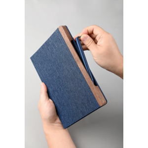 В блокноте 160 страниц в линейку кремовой бумаги плотностью 80 г/м2. Материал текстильной обложки изготовлен из переработанного (RPET) пластика. Ручка с синей пастой, стержень легко заменить.