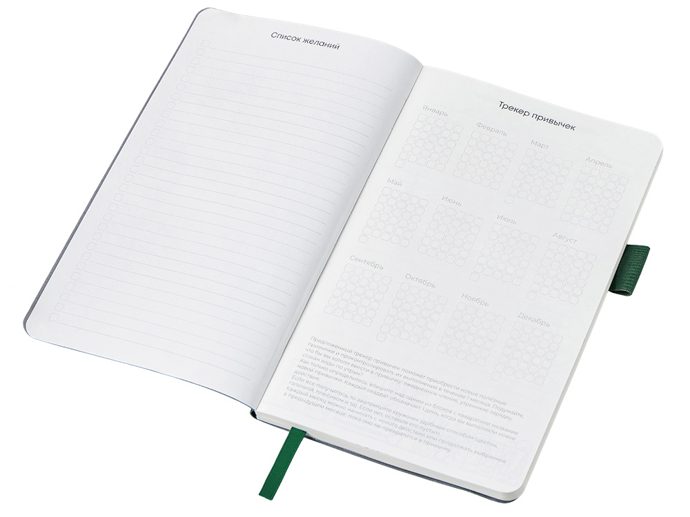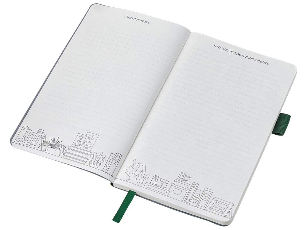 Стильный блокнот в гибкой обложке из текстурной искусственной кожи, приятной на ощупь. 96 очень приятных на ощупь листов повышенной гладкости с FSC-сертификатом обеспечивают комфортное письмо и аккуратный вид записей. Необычный для блокнота вводный блок включает трекер привычек, списки книг и фильмов, а также 4 страницы для раскрашивания с картинками и мандалами. Продуманные детали — резинка для закрытия, петля для ручки и ляссе — делают использование максимально удобным. Благодаря конверту для мелочей вам всегда будет куда положить визитки, записки и другие мелочи. Идеальный вариант для выстраивания баланса между работой и отдыхом.
