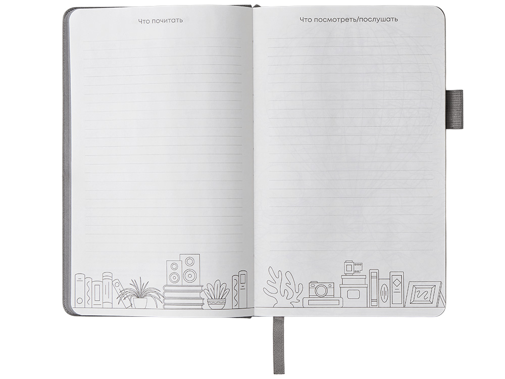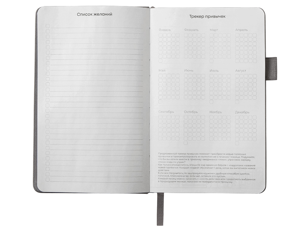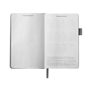 Стильный блокнот в твердой обложке из текстурной искусственной кожи, приятной на ощупь. 96 очень приятных на ощупь листов повышенной гладкости с FSC-сертификатом обеспечивают комфортное письмо и аккуратный вид записей. Необычный для блокнота вводный блок включает трекер привычек, списки книг и фильмов, а также 4 страницы для раскрашивания с картинками и мандалами. Продуманные детали — резинка для закрытия, петля для ручки и ляссе — делают использование максимально удобным. Благодаря конверту для мелочей вам всегда будет куда положить визитки, записки и другие мелочи. Идеальный вариант для выстраивания баланса между работой и отдыхом.
