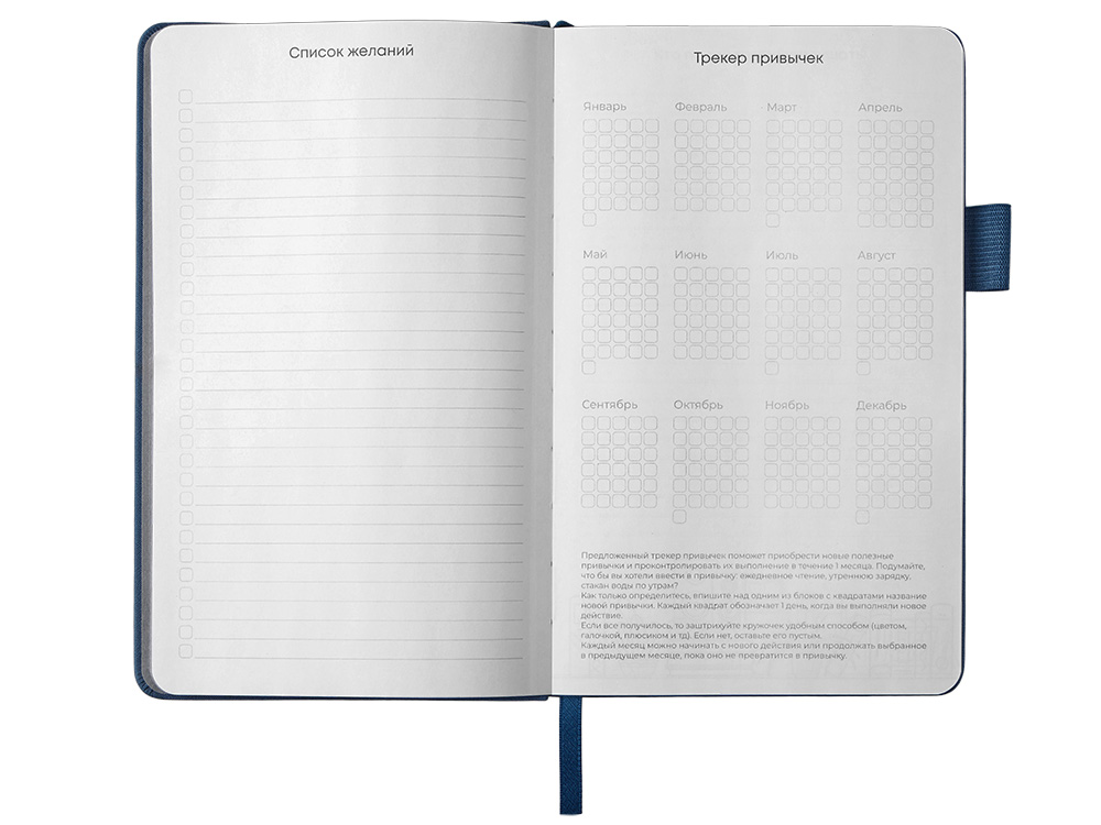 Стильный блокнот в твердой обложке из текстурной искусственной кожи, приятной на ощупь. 96 очень приятных на ощупь листов повышенной гладкости с FSC-сертификатом обеспечивают комфортное письмо и аккуратный вид записей. Необычный для блокнота вводный блок включает трекер привычек, списки книг и фильмов, а также 4 страницы для раскрашивания с картинками и мандалами. Продуманные детали — резинка для закрытия, петля для ручки и ляссе — делают использование максимально удобным. Благодаря конверту для мелочей вам всегда будет куда положить визитки, записки и другие мелочи. Идеальный вариант для выстраивания баланса между работой и отдыхом.