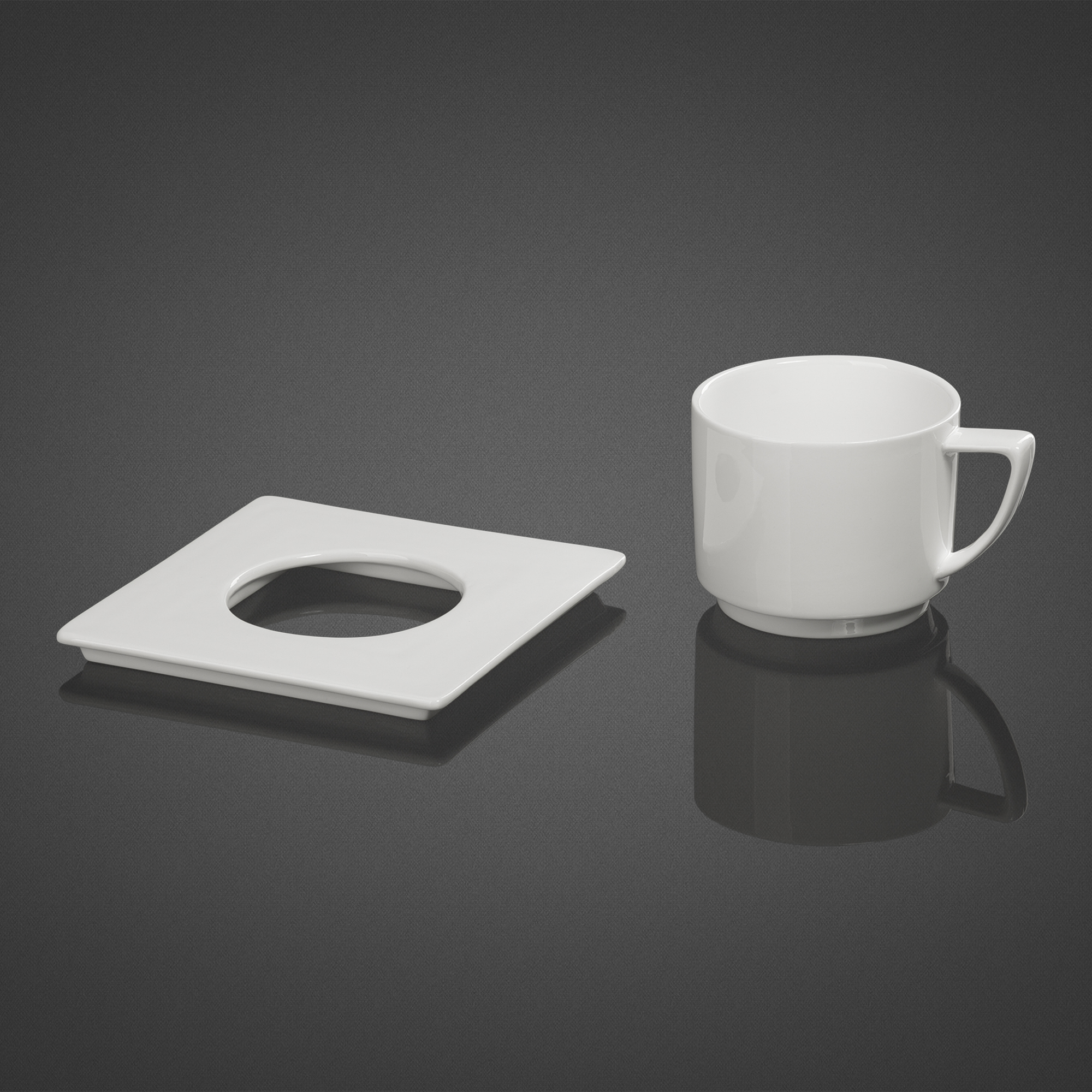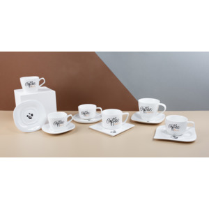 Изделия выполнены из белого фарфора, стильную чашку объемом 280 мл эффектно дополняет оригинальная форма блюдца.