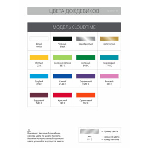 - Цвет дождевика: белый, черный, серебристый, золотистый, желтый, зеленое яблоко, зеленый, бирюзовый, голубой, синий, сиреневый, розовый, бордовый, красный, оранжевый;