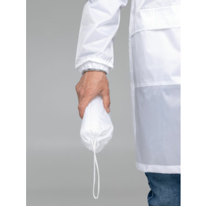 Плащ–дождевик на молнии с капюшоном и рукавами реглан. Ветрозащитные манжеты на рукавах.