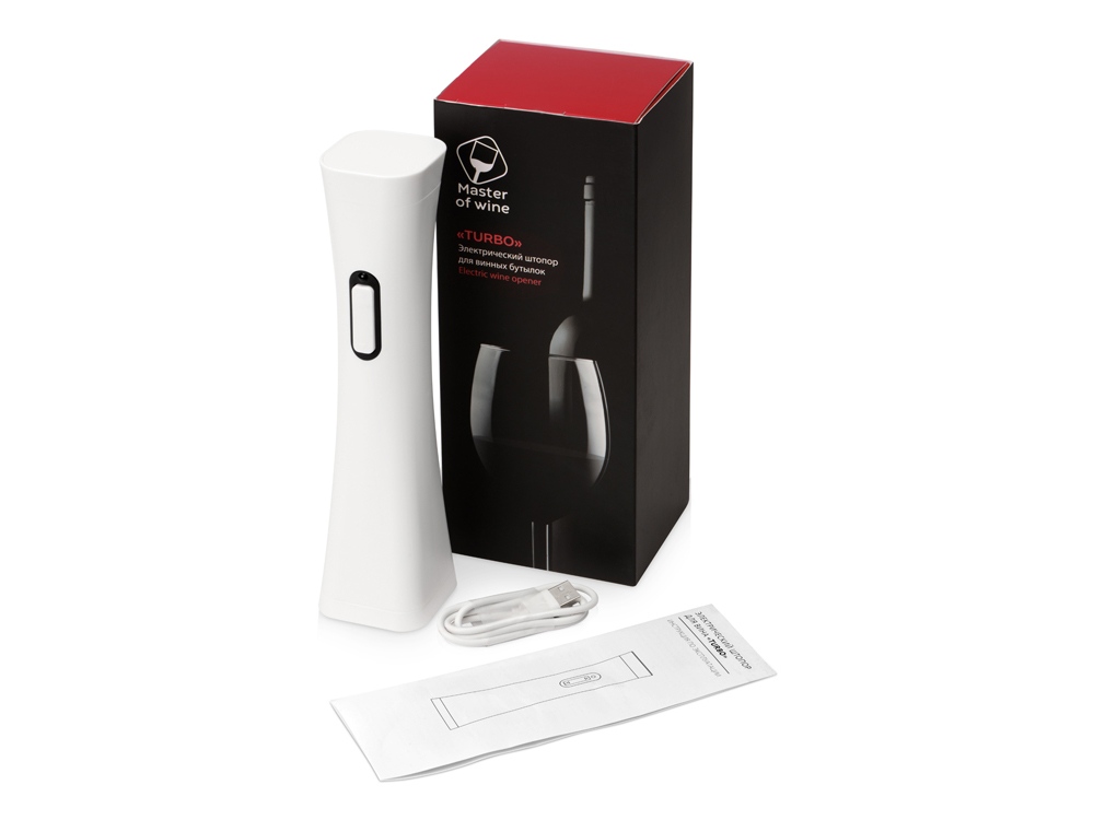 Потрясающе полезный и впечатляющий подарок ценителям вин - электрический штопор ""Turbo"". С ним всегда легко и просто! Всего 7 секунд и пару нажатий - и бутылка вина откупорена! В комплектации: штопор, нож для обрезания фольги, инструкция по использованию, USB кабель. • Штопор дополнен ножом, предназначенным для срезания фольги с горлышка винной бутылки; • пробка выкручивается с помощью нажатия всего одной кнопки; • скорость открывания – 7 секунд; • питание: литиевый аккумулятор; • уровень шума до 65 Дб; • диаметр пробки: 18-23 мм; • наружный диаметр бутылки не более 35 мм; • поставляется в брендированной коробке с шубером; • емкость аккумулятора 800M mAh; • продолжительность работы: до 60 бутылок на одной зарядке; • 8 часов для полной подзарядки штопора; • наличие индикатора уровня заряда. Нижняя и верхняя часть одной и той же кнопки отвечают за спуск и поднятие спирали, которая вытаскивает пробку из бутылки.
