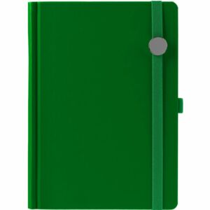 Ежедневник с твердой обложкой без поролона, выполнен из материала Soft Touch Ultra, зеленый FF, дополнен резинкой шириной 1 см, петлей-резинкой для ручки, капталом и ляссе ярко-зеленого цвета.