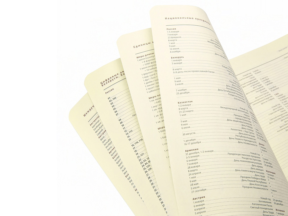 Недатированный ежедневник «Prestige» от бренда Bruno Visconti - это качественный корпоративный подарок по выгодной цене, произведенный специально под персонализацию. Представлен в универсальном формате А5 и содержит 320 страниц. Не лишенный солидности и респектабельности новый ежедневник Prestige от Bruno Visconti идеально дополняет имидж современных профессионалов. Твердая обложка выполнена из гладкого кожзама, неотличимого от кожи “fiore vegetale”. Скругленный корешок и уголки обложки в сочетании с магнитным клапаном делают ежедневник Prestige невероятно стильным аксессуаром. Глянцевая поверхность материала акцентирована контрастной белой строчкой вдоль закругленного края. Функциональная деталь - широкий магнитный клапан. Декоративный хлястик надежно фиксирует блок, исключая случайное раскрывание в сумке. В ежедневнике «Prestige» есть полезная справочная информация на русском языке, а также страницы для записи идей, мыслей и составления рабочих планов. Дни недели указаны сокращенно на английском языке. Для изготовления страниц используется качественный бежевый офсет повышенной плотности (70 г/кв м), который производится в Японии и подходит для всех видов чернил. Разметка блока с указанием времени позволяет планировать дела с точностью до 1 часа. Ежедневники от бренда Bruno Visconti можно персонализировать с помощью всех видов тиснения обложки. Наши ежедневники помогут быть успешным и эффективным в карьере и повседневной жизни!