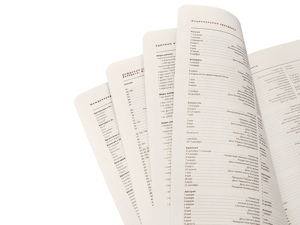 Недатированный ежедневник «PARLIAMENT» формата A5 в твердом переплете – элегантный деловой аксессуар, подчеркивающий статус владельца с продуманным до мелочей функционалом: - твердая обложка из высококачественной экокожи с декоративной нитью по периметру в тон ежедневника; - серебряный срез, контрастирующий с цветом обложки; - скругленные перфорированные углы блока и двойное ляссе для удобства навигации; - внутренний блок с увеличенным количеством страниц - 352, содержит несколько разделов: - страница для персональных данных; - раздел справочной информации на 17 страницах (часовые пояса, аэропорты Европы, международные телефонные коды, размер одежды, телефонные коды России, Беларуси, Казахстана, Армении, цифровые автомобильные коды, римские цифры, расход калорий при физической нагрузке, формат бумаги, десятичные приставки, единицы измерения, греческие буквы, штрихкоды, время распада алкоголя в крови, города-миллионники, национальные праздники, термины международной торговли, температура, скорость, давление, буквенные коды стран, энергетическая и питательная ценность продуктов, страны мира, заметки); - раздел для планирования с разлинованными листами и указанием времени с интервалом в один час; - картонный слив-бокс.