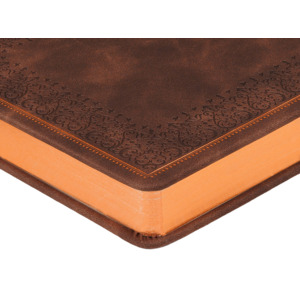 Недатированный ежедневник "Royal" формата А5 с твердой обложкой из искусственной кожи с имитацией нубука украшен художественным бронзовым и блинтовым тиснением. Внутри 256 страниц, выполненных из качественной бежевой бумаги в линейку плотностью 100 г/м². Два шелковых ляссе в цвет обреза блока и обложки облегчают навигацию по записям. Французский корешок дополнительно декорирован изящным бронзовым тиснением в виде виньеток. Скругленные углы обложки и блока подчеркивают стильный дизайн изделия, а блеск бронзового обреза дарит ежедневнику благородный и роскошный внешний вид.