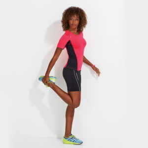Женская футболка с рукавами реглан для занятий спортом со светоотражающими элементами. Боковые вставки из "дышащей" сетки предназначены для вентиляции и отвода влаги.