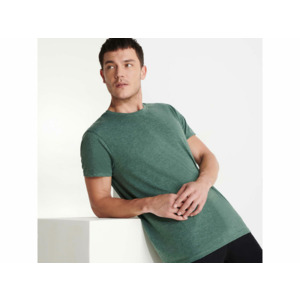 Футболка без боковых швов с коротким рукавом в меланжевом эффекте. Риб горловины 1х1 дополнительно укреплен двойной строчкой.