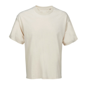 Футболка оверсайз унисекс с круглым вырезом, без боковых швов, высокой плотности. Выполнена из смеси переработанного хлопка (50%) и обычного хлопка (38%) с добавлением вискозы (12%).
