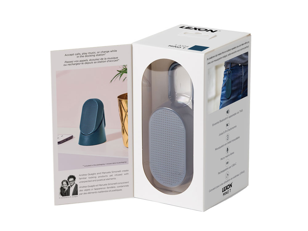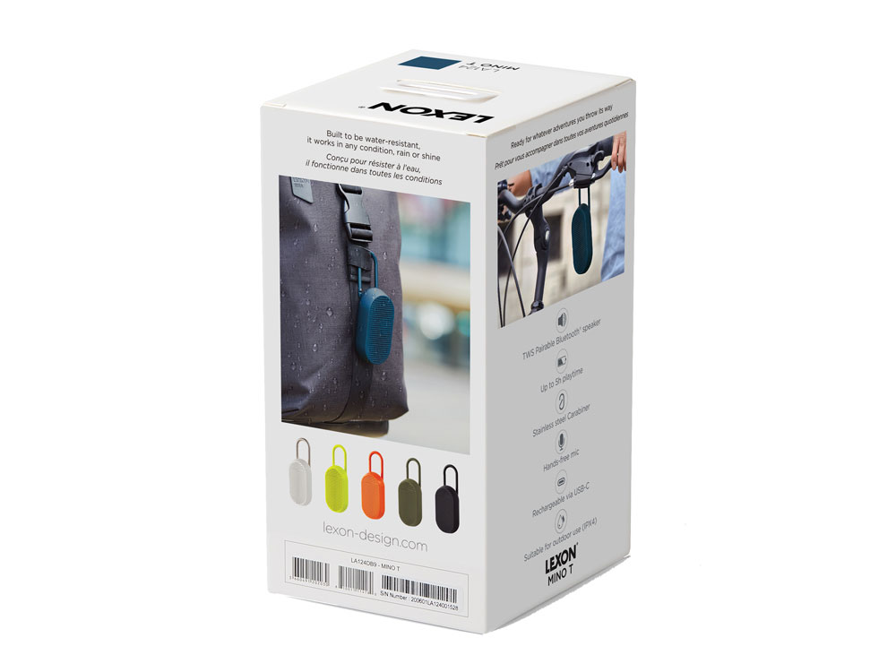 Mino T — это универсальная Bluetooth-колонка, созданная для путешествий. Карабин позволяет легко прикрепить её к сумке или велосипеду. Благодаря элегантному дизайну она гармонично впишется в интерьер, став современным элементом. Оснащённая пассивной басовой системой, Mino T обеспечивает качественное прослушивание, гарантируя сбалансированный и насыщенный звук в дороге. Не беспокойтесь о дожде: сверхпрочное покрытие делает её водонепроницаемой. Наслаждайтесь до 5 часов автономной работы в любых приключениях. Отвечайте на звонки, слушайте музыку или заряжайте колонку через кабель USB-C, установив её на док-станцию. - Bluetooth®-динамик со встроенным карабином - Совместимость с технологией TWS - Водонепроницаемость IPX4 - Микрофон "hands-free" - Пульт дистанционного управления для селфи - Bluetooth® 4.2 - Время работы аккумулятора: 5 ч - Время зарядки: 2 ч - Расстояние Bluetooth®: 10 м - Питание: через порт USB C, кабель в комплекте