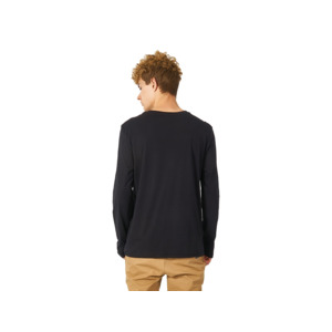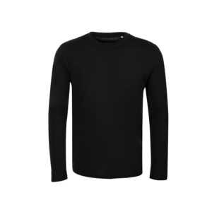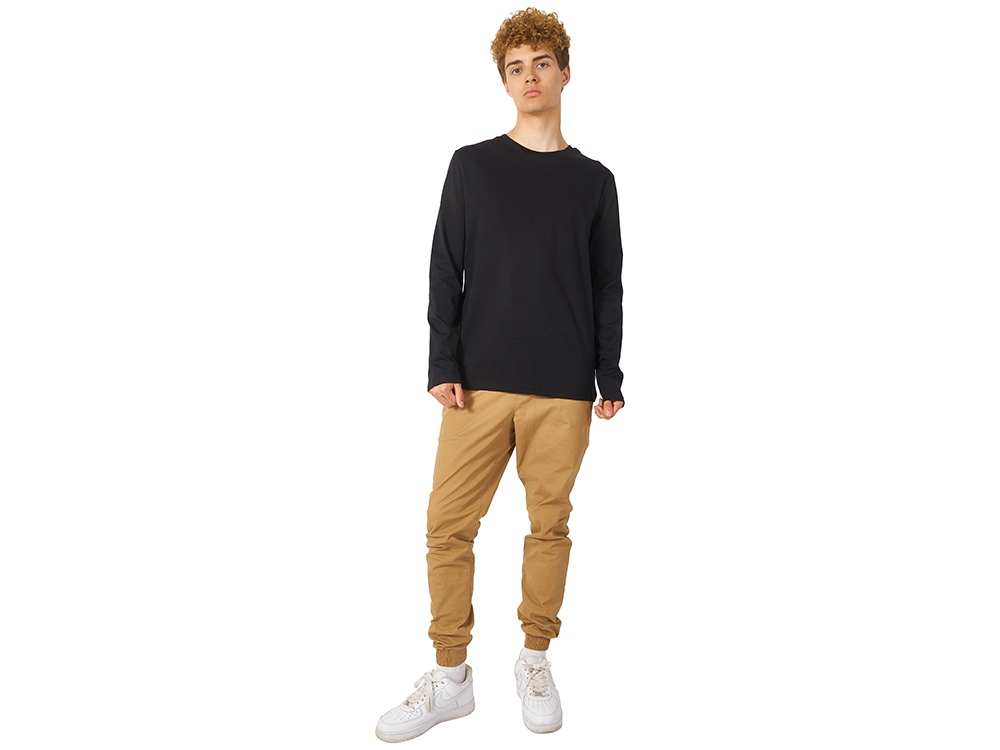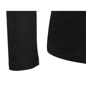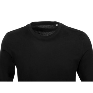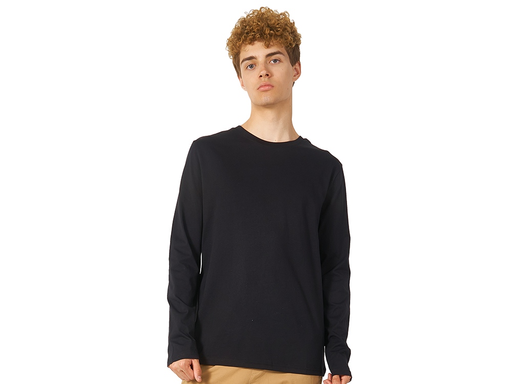 Футболка с длинным рукавом комфортной посадки с боковыми швами. Горловина обработана рибом 1х1 и тесьмой по спинке. Футболка выполнена из хлопкового джерси.