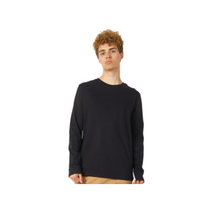 Футболка с длинным рукавом комфортной посадки с боковыми швами. Горловина обработана рибом 1х1 и тесьмой по спинке. Футболка выполнена из хлопкового джерси.