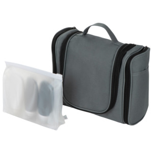 Набор "On air" состоит из двух предметов: Несессер для путешествий. Эргономичный и вместительный, имеет внутренние и внешние карманы и большое отделение внутри. Оснащён ручкой для переноски и крючком для подвешивания. Нейтральный лаконичный дизайн позволяет преподнести несессер как мужчине, так и женщине; Силиконовые ёмкости для косметических средств. Три флакончика по 90 мл каждый пригодятся для коротких поездок, а еще они вписываются в лимит большинства авиакомпаний по провозу жидкости в ручной клади. - силиконовые флакончики упакованы в полупрозрачную косметичку из EVA; - колпачок для зубной щётки в комплекте; - в несессере предусмотрены резинки и кармашки для мелких предметов, например, бритвенного станка.