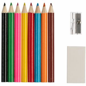 - Размеры: пенал: 11х5х3 см; карандаш 8,7х0,5 см; ластик 4х0,5х2 см; точилка: 2,5х1х0,8 см