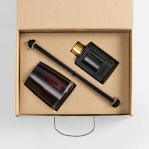 - Материал: флакон, подсвечник - стекло, палочки из файбера; свеча - воск; коробка - микрогофрокартон