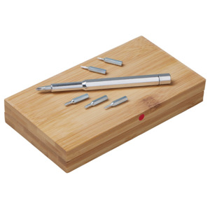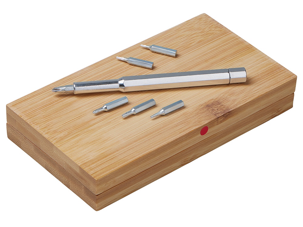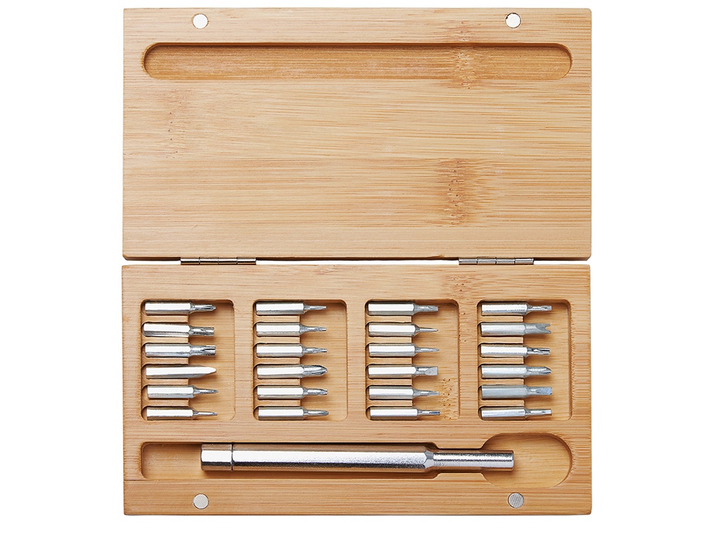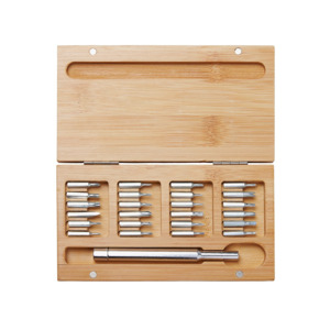 Стильный и практичный набор отверток в элегантном корпусе из натурального бамбука. Компактный кейс закрывается на магниты, а верхняя крышка отмечена круглым красным стикером для удобной идентификации. Внутри — отвертка и 24 наиболее востребованные биты: крестовые, плоские и «звездочки», которые подойдут для решения большинства бытовых и профессиональных задач. Набор выполнен из экологичных материалов — прочной стали и натурального бамбука. Классическая прямоугольная форма без выступающих деталей делает его особенно удобным для персонализации и нанесения логотипа. • 24 популярные биты в одном наборе • Экологичные материалы: натуральный бамбук и сталь • Магнитная фиксация крышки • Удобная прямоугольная форма под нанесение логотипа • Компактный и презентабельный дизайн