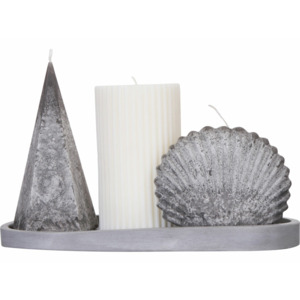 Этот набор из трех ароматических свечей непременно понравится приверженцам минимализма и стилей хай-тек, лофт, эко и скандинавского. Лаконичная геометрия, сочетающаяся с природным дизайном ракушки, натуральные молочный и неоднородный серый оттенки и подставка из гипсобетона смотрятся естественно, стильно и ненавязчиво. Благородный аромат черного перца и кожи, одновременно свежий и терпкий, подарит ощущение комфорта и уверенности. Свечи на 80% изготовлены из натуральных соевого и кокосового воска, не токсичны при горении и не вредны для дыхания. После того как свечи прогорят, подставку можно использовать для пало санто или других благовоний, а также для хранения различных мелочей или ювелирных украшений. - Минималистичный дизайн - Многофункциональная подставка из гипсобетона - Экосостав - Ручная работа