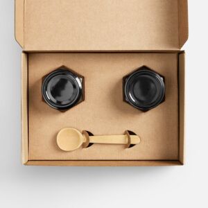 - Материал: коробка - микрогофрокартон; баночки - стекло, жесть; ложка - бамбук