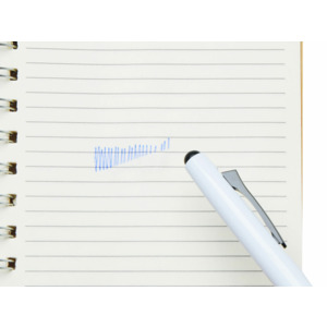 Пластиковая шариковая ручка со стирающимися чернилами. Синие чернила стираются с помощью ластика в верхней части ручки.