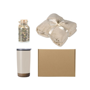 - Материал товара - плед - флис из 100% полиэстера, термокружка - нержавеющая сталь снаружи, полипропилен внутри, сокочай - стекло, пробковая крышка, коробка - картон