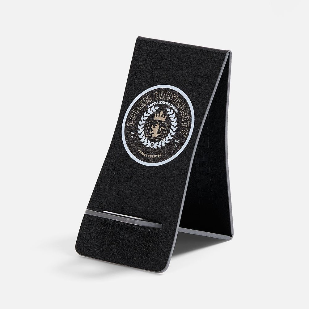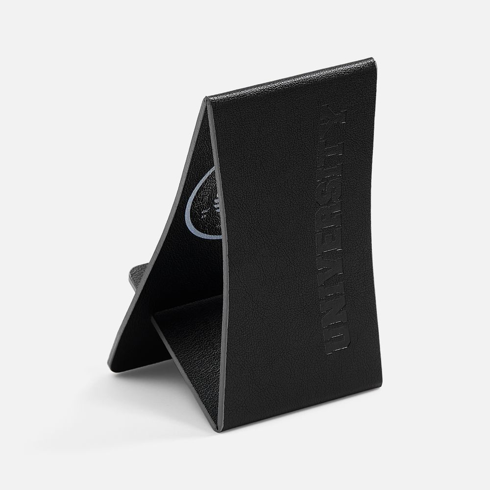 Складная подставка для телефона с вырубкой под шнур зарядного устройства. Выполнена из материала Petrus.